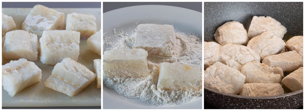 Una vez listo, escurridlo, secadlo, quitadle las espinas y la piel y cortadlo en trozos no demasiado grandes. Pasadlo por harina, eliminando el exceso, y reservadlo.