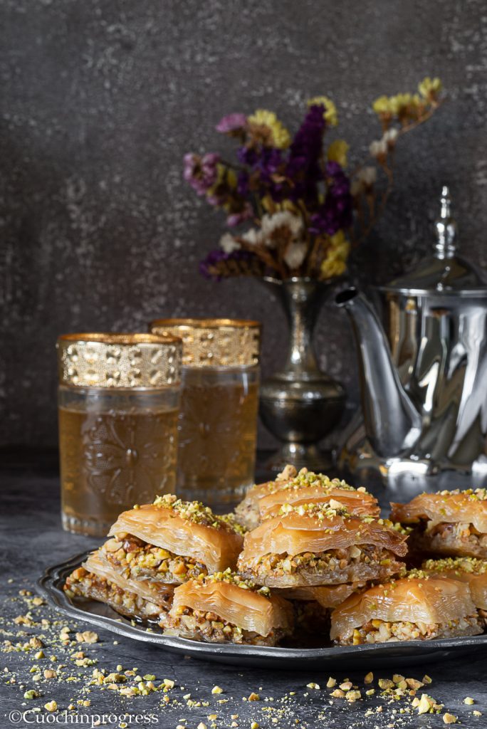 El (o la) BAKLAVA es un dulce y rico postre a base de masa filo y frutos secos, originario de Turquía pero extendido por todo Oriente, allá donde llegó el Imperio otomano. De hecho, la historia del baklava no es segura, pero muy probablemente se trate de un plato turco procedente de Asia Central, desarrollado en su forma actual en las cocinas imperiales del Palacio de Topkapi en Estambul. El baklava es un postre complejo y estratificado, formado por finas láminas de masa filo, como hojas o papeles, untadas con mantequilla y colocadas en una fuente: nueces picadas más o menos finamente (que se pueden sustituir por pistachos) se espolvorean entre las distintas capas, que luego se hornean antes de empaparlas con una mezcla de azúcar y zumo de limón o con miel y especias aromatizadas con agua de rosas.