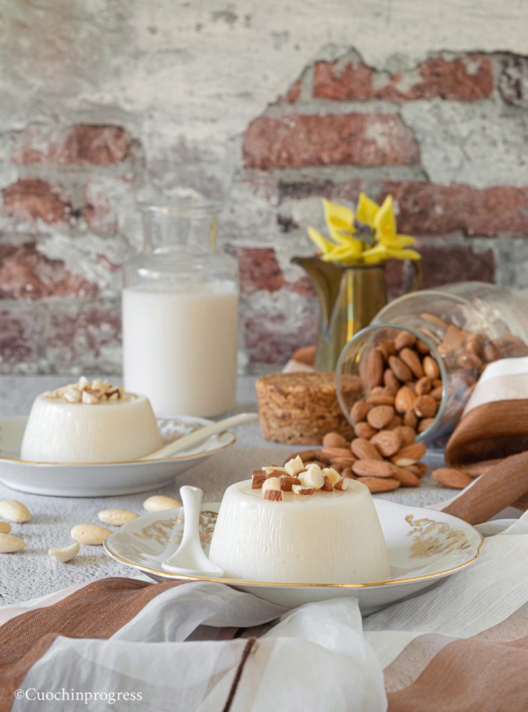 Como suele ocurrir con los platos de tradición antigua, existen diferentes variantes del postre. Yo sigo una receta muy sencilla – pero, se lo aseguro, realmente buenísima – a base de bebida de almendra (o leche de almendra), fácilmente disponible en cualquier supermercado. La frescura de este budín en particular, unida al intenso aroma de las almendras y al sabor delicado, hace un verdadero milagro, dando al paladar una satisfacción realmente extraordinaria. Pruébelo y contadme.