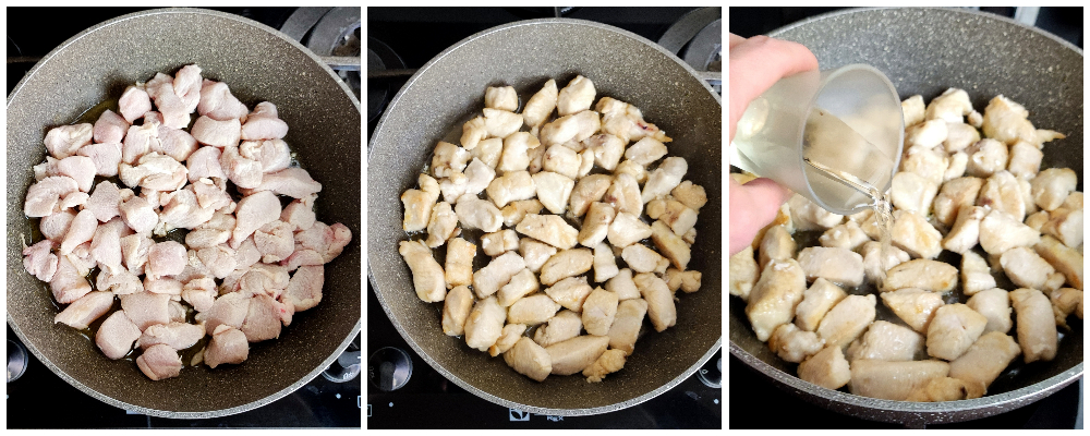 • En una sartén amplia sofríe ligeramente el aceite, añade los bocaditos de pollo bien sacudidos para eliminar el exceso de harina y dóralos a fuego vivo por todos los lados, de forma que se selle la carne. Añade el vino blanco y deja evaporar.