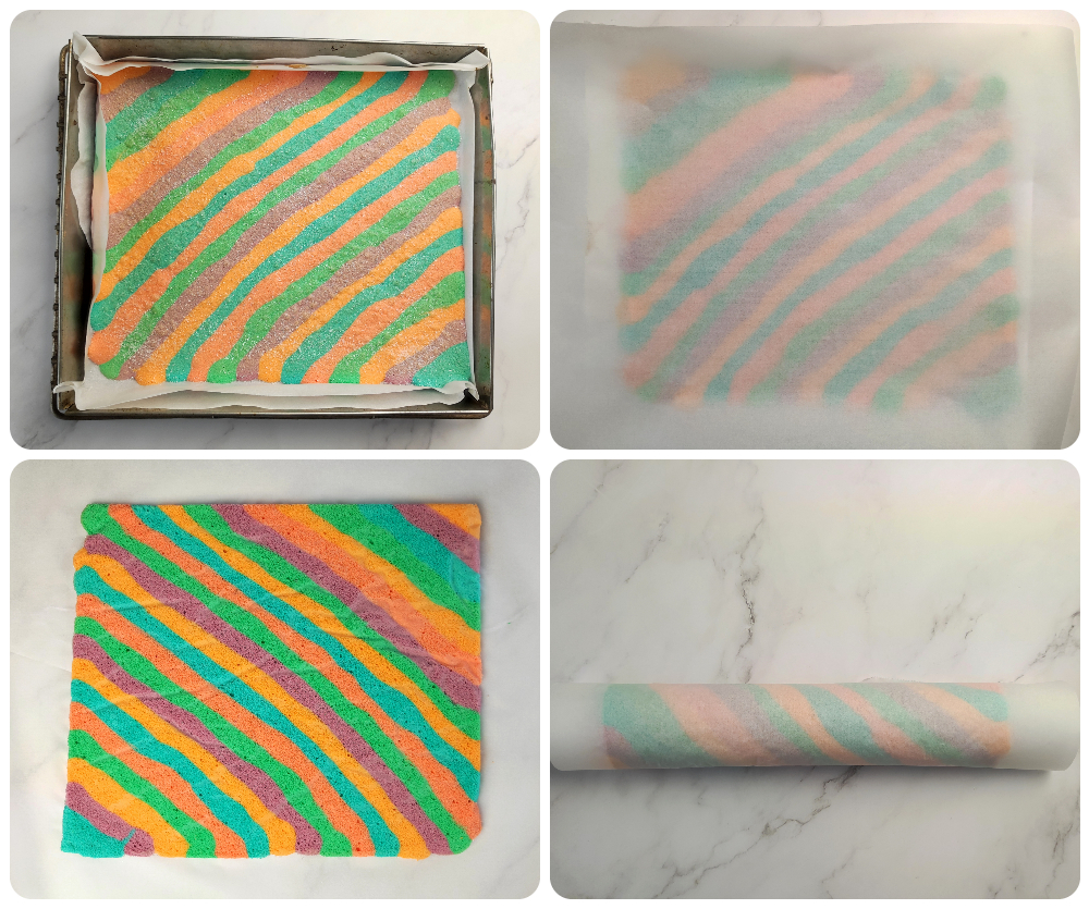 • Transcurrido el tiempo de reposo, colocad el brazo arcoíris en una fuente y servidlo cortado en rodajas de 2 cm.