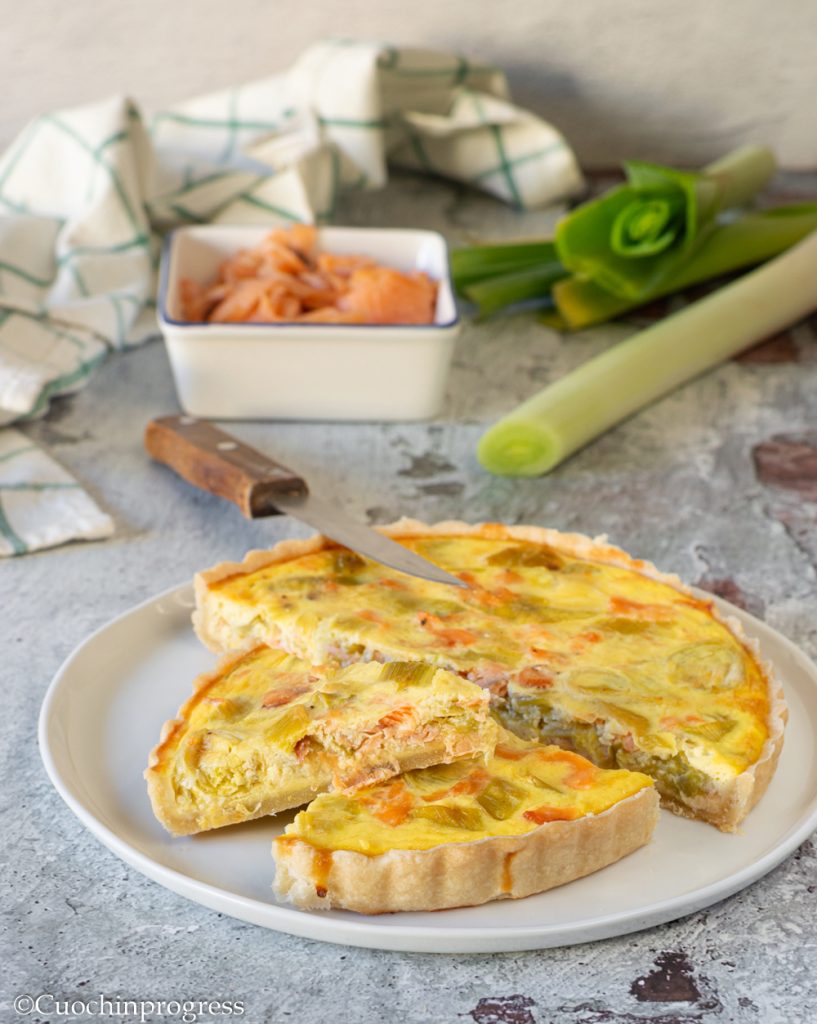 El plato no requiere mucho esfuerzo, sobre todo si seguís la receta paso a paso que encontráis a continuación. Os aconsejo preparar la masa brisée con antelación (es incluso mejor estirarla después de haberla dejado en el frigorífico); el horneado y el montaje de los ingredientes del relleno requerirán muy pocos minutos y ninguna dificultad. En poco tiempo comprobaréis también vosotros cómo el aroma y la dulzura del puerro combinan de maravilla con el salmón ahumado, sabroso y delicado…