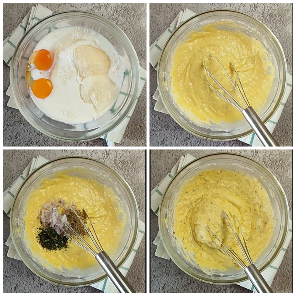En un bol mezclad la harina tamizada, la levadura, el pecorino, el parmesano, los huevos, una pizca de sal y la leche. Con la ayuda de un batidor manual, mezclad todos los ingredientes hasta obtener una masa lisa. Si la masa quedara demasiado espesa, añadid más leche.