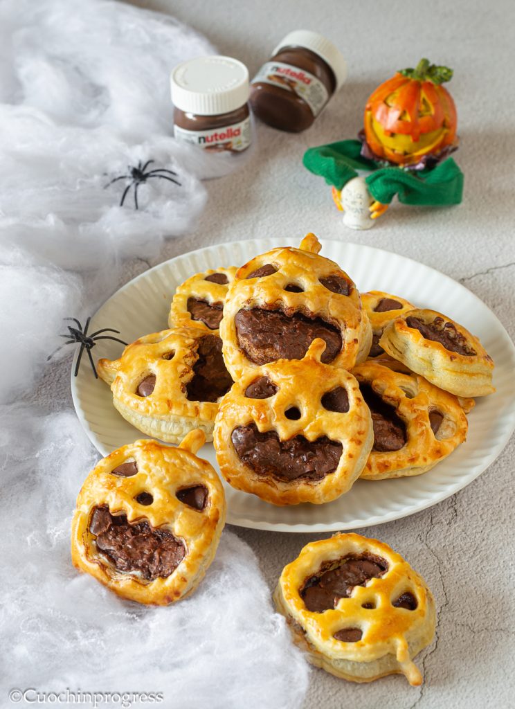 Las CALABAZAS DE HOJALDRE Y NUTELLA son unos dulces simpáticos y riquísimos, ideales para ofrecer en la noche de Halloween, capaces de convertir la fiesta más querida por los niños americanos en un momento alegre y divertido para todos. Dada la facilidad con la que pueden prepararse, estas pequeñas y dulces calabazas se pueden hacer junto con los propios niños, que pueden prepararse para la noche de los espectros (y de los dulces) metiendo ellos mismos las manos en la masa, orgullosos de poder luego enseñar sus creaciones a amigos y familiares.