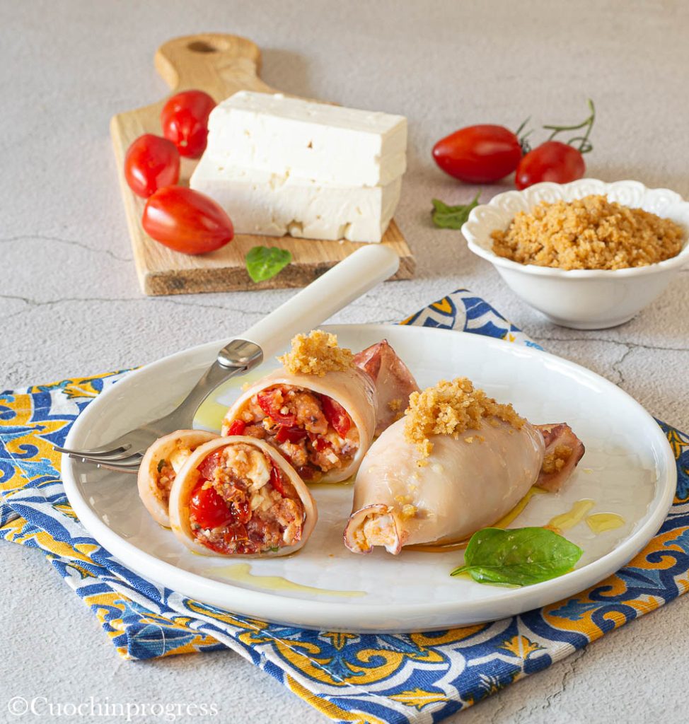 Los CALAMARES RELLENOS DE FETA Y TOMATITOS son un perfecto segundo plato o plato único, si se prepara en abundancia: frescos, fáciles de preparar y ricos en sabor, que te transportan a Grecia desde el primer bocado. El plato es ideal para prepararlo y servirlo en verano, acompañado de una ensalada, quizá griega, o de verduras a la parrilla.