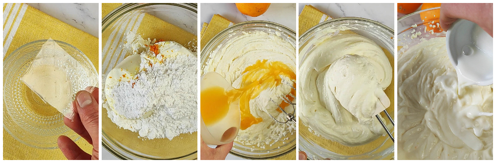 En un bol coloca el queso crema, la ricotta, la ralladura de naranja y el azúcar glas. Trabaja todo con las varillas eléctricas, añade el zumo de la naranja y mezcla hasta obtener una crema homogénea.
