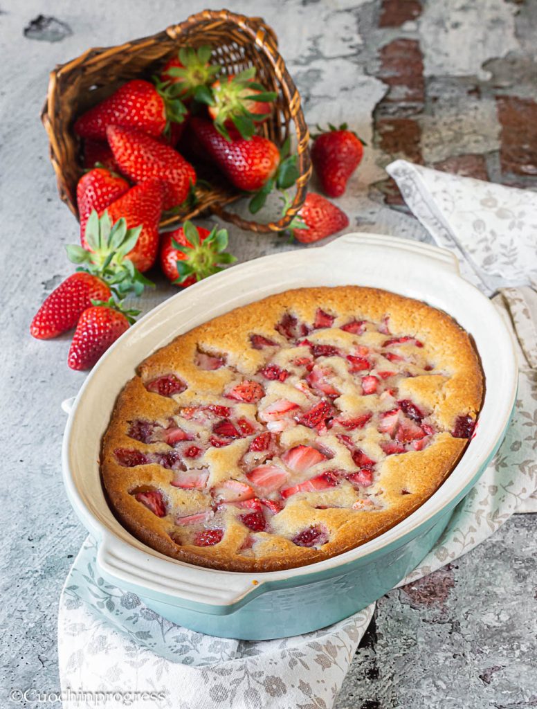 Una vez que el cobbler de fresas se haya enfriado a temperatura ambiente, podéis cubrir la fuente y meterla en la nevera hasta un máximo de 4 días.