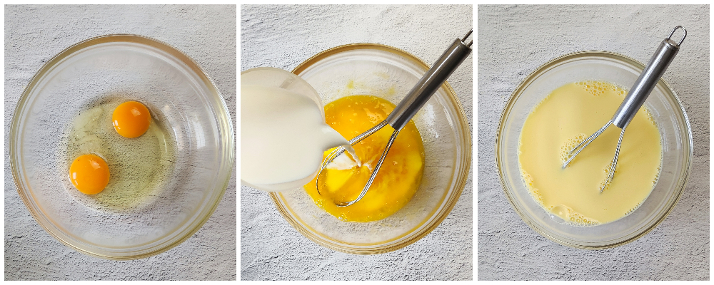 • Bate los huevos con un batidor de mano y añade la leche y una pizca de sal, sin dejar de batir.