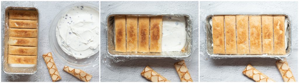 • Forra con film transparente un molde para plumcake (como alternativa puedes montar el dulce en una fuente, como si fuera un tiramisú).