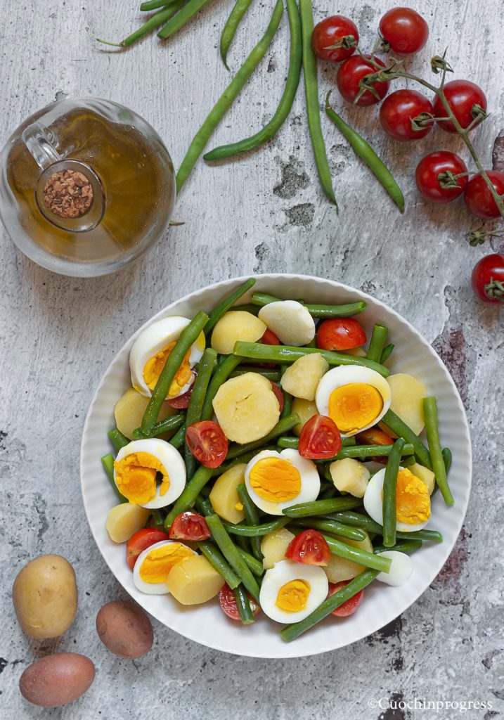 Esta receta solo requiere cuatro ingredientes, aparte del aliño: los tomatitos cherry, dulces pero con un ligero toque ácido; las judías verdes, frescas y crujientes; las patatas nuevas, que aportan cremosidad; y, por último, los huevos duros, llenos de sabor y nutrientes. Como plato único, esta ensalada debe aportar la energía adecuada, porque incluso en verano, aunque el calor nos empuje a buscar cosas frescas, hay que elegir alimentos nutritivos para no quedarse sin fuerzas mientras hacemos deporte o nos divertimos con amigos. En resumen, un plato rápido y al alcance de todos (que se puede preparar con antelación), pero realmente perfecto.