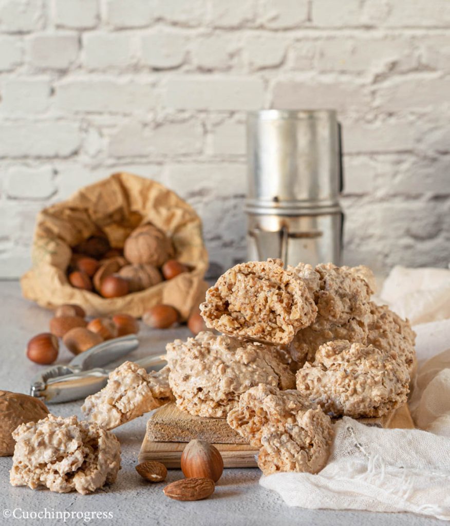 Los FEOS PERO BUENOS son galletas tradicionales elaboradas con claras de huevo, frutos secos y azúcar, rápidas y fáciles de preparar. Son perfectas para disfrutar en una dulce pausa del día, pero también como pequeños dulces al terminar la comida, para servir junto al café. Su origen no está del todo claro: algunos sostienen que son originarias de Gavirate, un municipio de la provincia de Varese, otros en cambio creen que nacieron en Borgomanero, en el Piamonte. Sea cual sea su procedencia real, no podemos sino agradecer a quien ideó esta delicia.