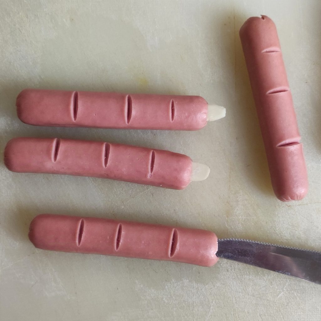 La preparación de esta espeluznante MANO CERCENADA es muy fácil y rápida. Para empezar, coge las salchichas tipo wurstel y, con la ayuda de un cuchillo, practica dos pequeños cortes no demasiado profundos solo en un lado.