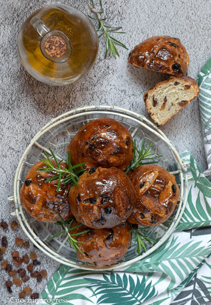 Una vez que vuestro pan de ramerino esté cocido, sacadlo del horno y, aún templado, pinceladlo con un almíbar hecho hirviendo el agua con el azúcar durante 2 minutos. De este modo obtendréis panes bien brillantes.