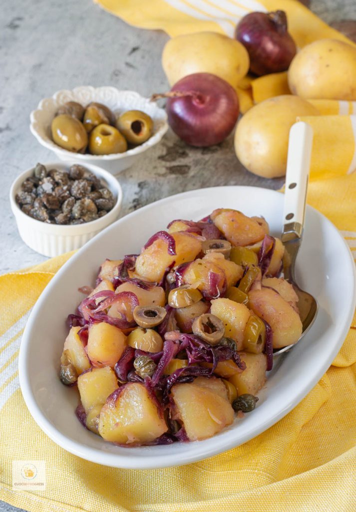 Las patatas, cortadas en dados, escaldadas y doradas en la sartén con dulces cebollas rojas, se realzan con un irresistible aliño a base de vinagre y azúcar, típico de la tradición insular, alcaparras y aceitunas.