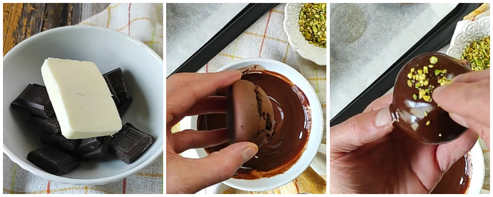 • Cubre la superficie de las rame de Nápoles con el chocolate, colócalas sobre una rejilla y espolvoréalas con el granillo de pistachos.