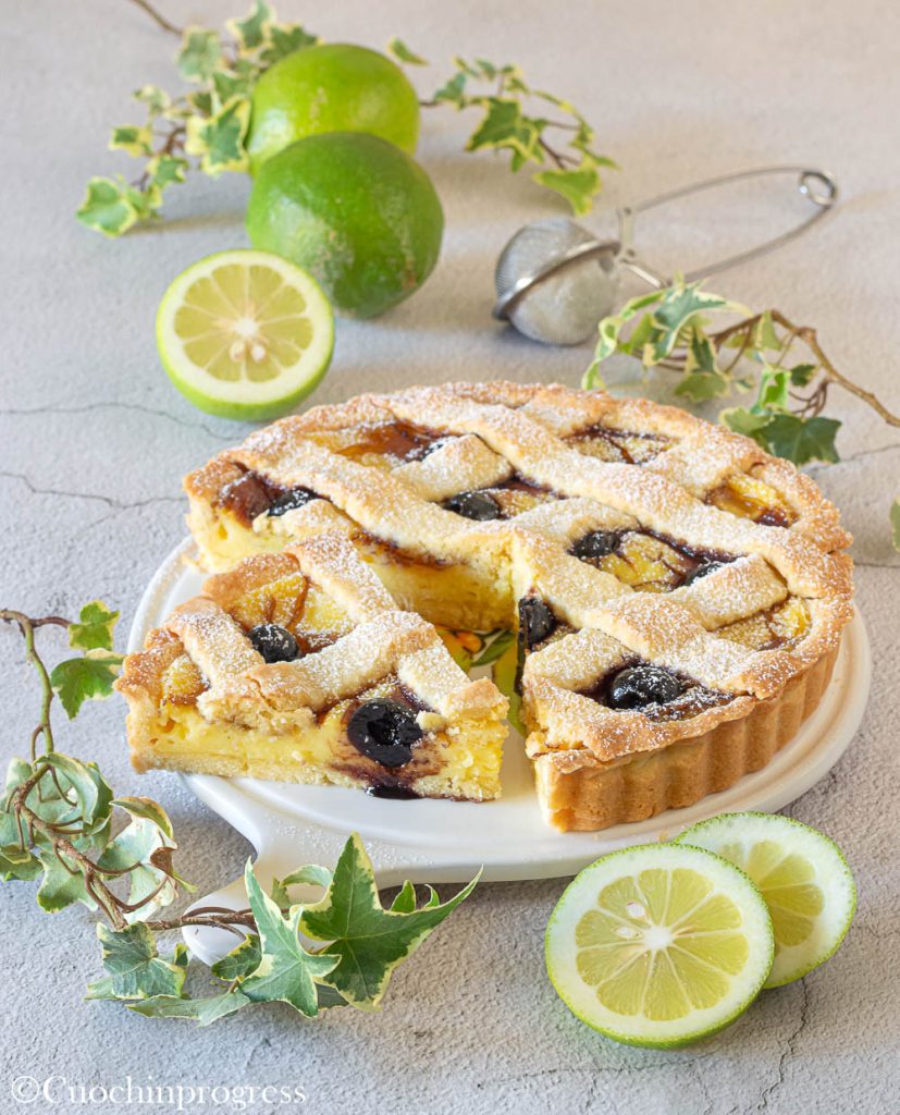 La TARTA AMALFITANA es un postre sencillo, elegante y aromático, inspirado en los sabores de la costa campana. Se compone de una base quebrada de masa de mantequilla, rellena con una sedosa crema pastelera perfumada con limón, el cítrico típico de la zona, y realzada con guindas en almíbar que aportan un agradable contraste entre lo dulce y un leve punto ácido.