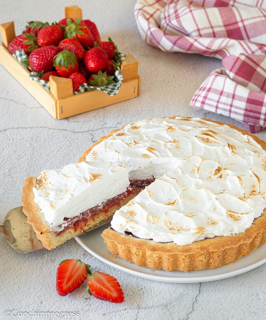 La TARTA DE FRESAS CON MERENGUE es un postre goloso y delicado, tan bueno como bonito de ver, perfecto para ofrecer al final de la comida, quizá cuando quieras mimar a un niño goloso o a una mamá de corazón dulce. Es facilísima de preparar y está llena de fruta, que le aporta aroma y un sabor inconfundible.