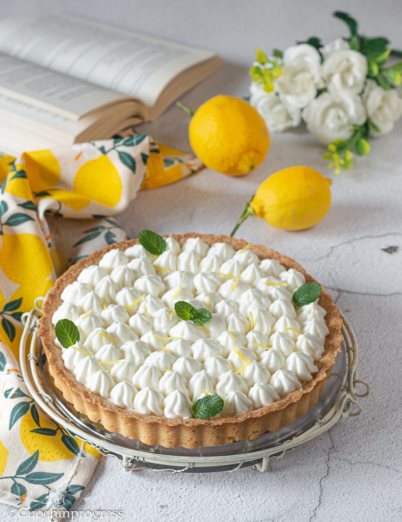 Esta tarta es realmente muy fácil de hacer porque solo requiere dos preparaciones rápidas: una masa quebrada normal y una delicada y aromática crema de limón sin huevos y sin leche, que está al alcance de todos. Luego podéis divertiros con la decoración: yo me limité a hacer pequeños lacitos y a añadir ralladura de limón y hojitas de menta, pero si queréis también podéis añadir fresitas, frutos rojos o cualquier otro ingrediente que combine bien con el limón y que aporte color y sabor al postre.