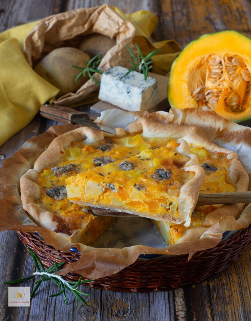La TARTA SALADA CON CALABAZA, PATATAS Y GORGONZOLA, de aroma envolvente y corazón cremoso y tierno, es un plato rústico y refinado a la vez, capaz de conquistar desde el primer bocado.