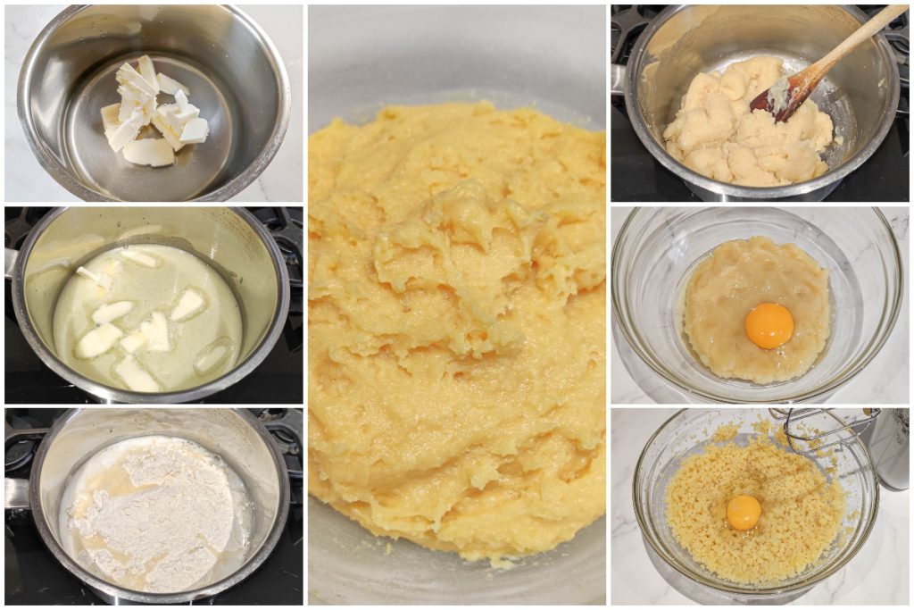 Retira la mezcla del fuego, pásala a un bol y deja que se temple. Añade los huevos uno a uno, esperando a que el primero se integre bien antes de añadir el siguiente. Debes obtener una masa lisa y bastante consistente.