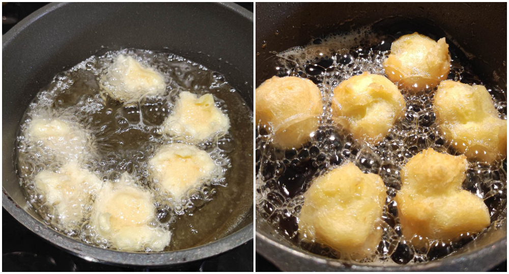 Rellena medio cucharilla con la masa y, ayudándote con otra cucharilla, déjala caer en el aceite. Fríe pocos tortelli a la vez (durante la cocción crecerán) manteniendo el fuego bajo para que se cocinen también por dentro.
