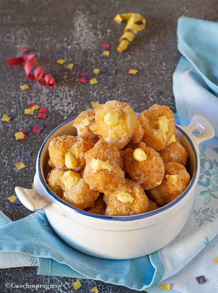 Los TORTELLI DE CARNAVAL CON CREMA son unos pastelitos deliciosos de la tradición familiar, una de las muchísimas variantes de los fritos buenísimos que no pueden faltar durante la fiesta más alegre del año. Recuerdan por el nombre a un dulce milanés y se parecen en el aspecto a las castagnole, pero en realidad son profiteroles fritos y rellenos de una crema pastelera suave y aromática, aun más esponjosa por la nata montada.