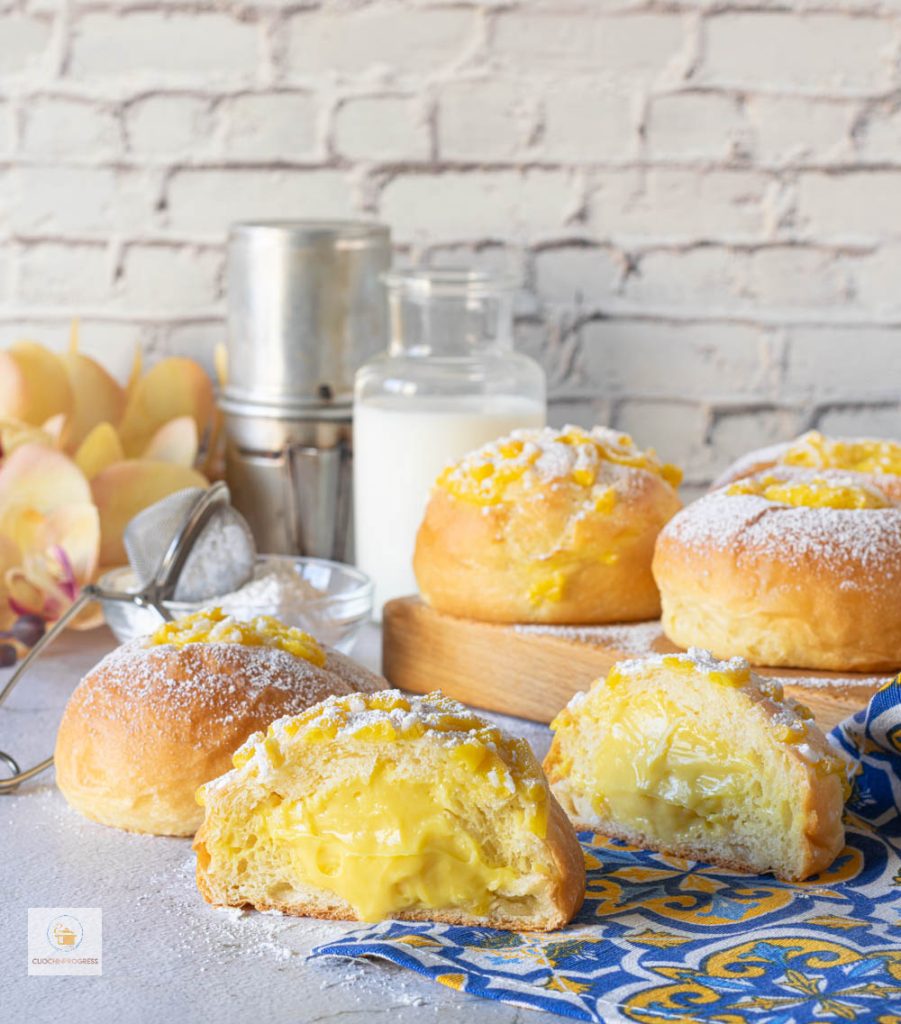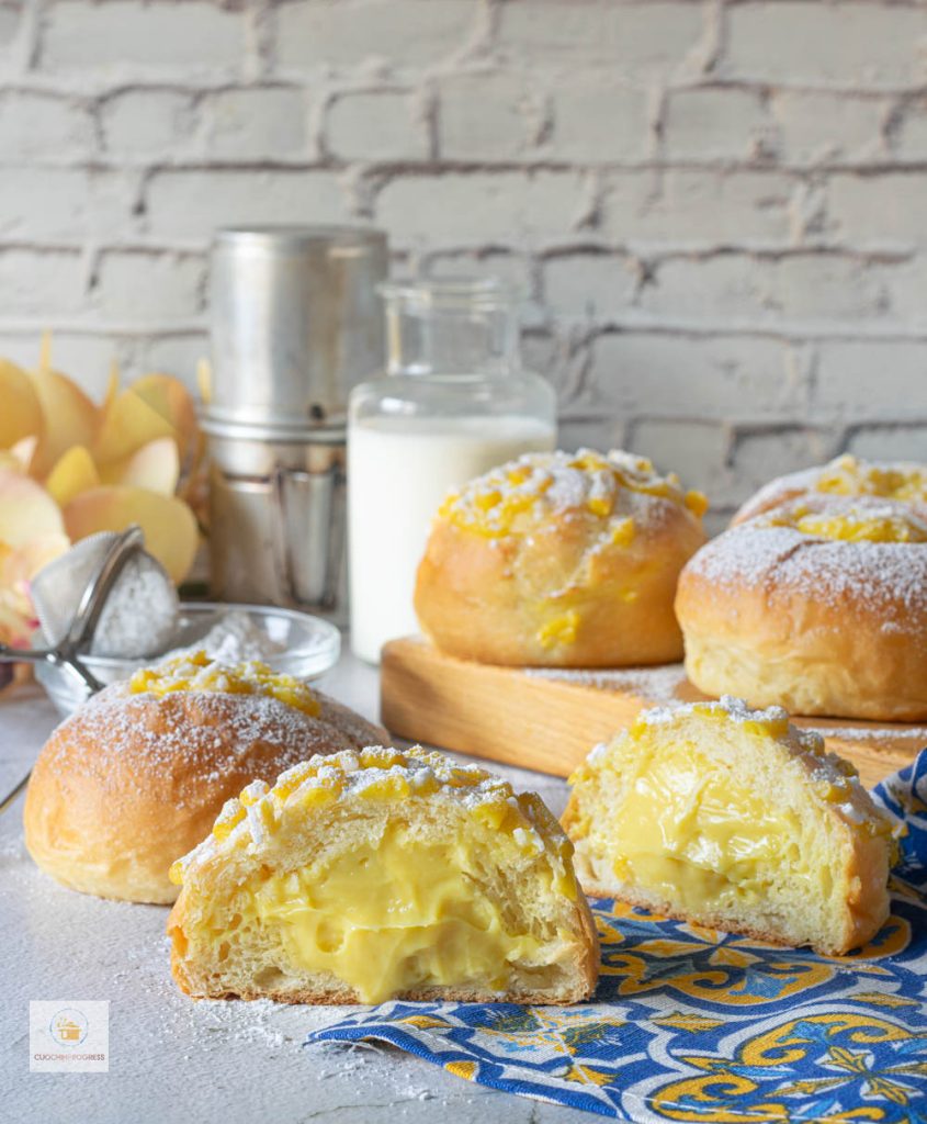 Estas brioche son el encuentro perfecto entre suavidad y golosidad: la masa, fermentada durante largo tiempo, ofrece una textura aérea que se deshace literalmente en la boca, mientras que la crema pastelera añade una nota envolvente y cremosa que conquista desde el primer bocado. Perfectas para empezar el día con un toque dulce, para una merienda elegante o para un brunch dominical, las venecianas con crema llevan a la mesa el encanto de la verdadera pastelería italiana.