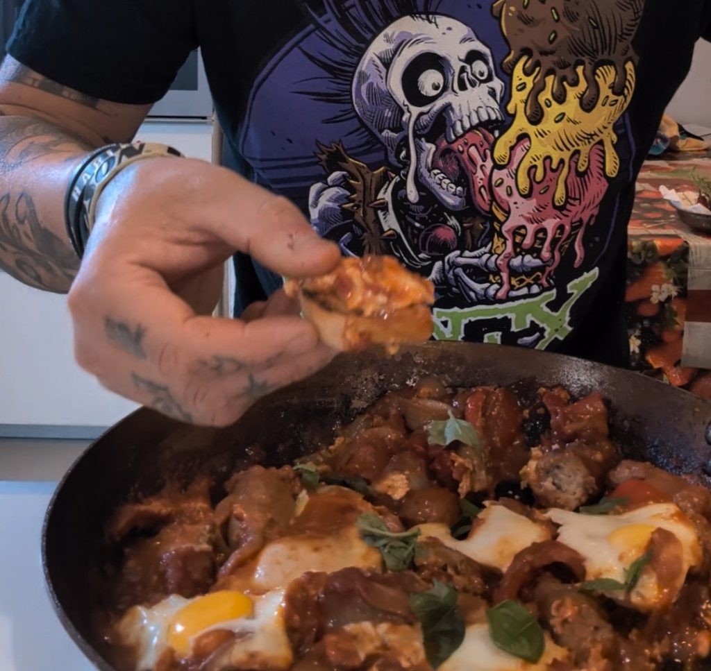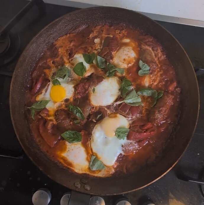 • Antes de servir, deja reposar todo en la sartén durante unos diez minutos. Este paso permite que los sabores de todos los ingredientes se amalgamen perfectamente, creando una experiencia gustativa aún más rica. Sirve una porción abundante de huevos al tomate en un plato caliente. Acompaña con rebanadas de pan fresco, perfecto para recoger la salsa sabrosa. Cada bocado será una explosión de sabor, gracias a la combinación de huevos tiernos, salsa de tomate rica y especias aromáticas