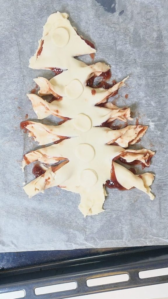 Asegúrate también de presionar bien las dos capas de hojaldre en la tira central y en los extremos, para que se adhieran antes de hornear.