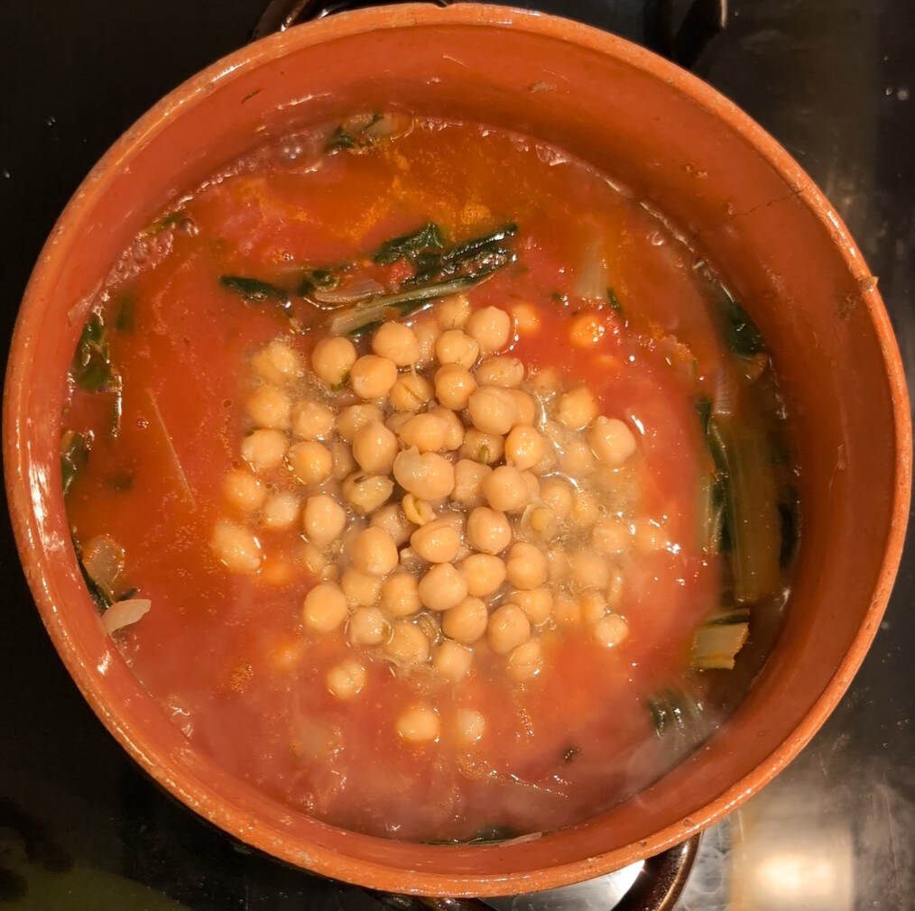• Ahora añadid los garbanzos y cocinaremos aún más hasta que todo se espese, como si fuera una sopa para comer con cuchara y mojar pan en cada bocado.