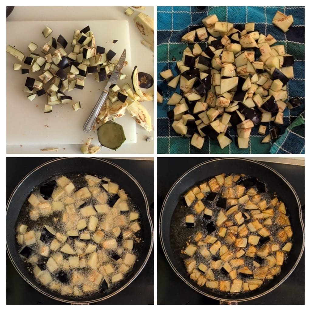 • Para empezar la caponata de berenjenas he cortado en cubos una berenjena y la he puesto bajo sal por media hora para eliminar el líquido amargo y hacerlas menos amargas. Luego las he lavado, secado con un paño de algodón y las he frito en aceite hasta que se volvieron doradas. Si quieres sustituir el aceite, puedes cocinarlas en el horno. Precalienta el horno a 200 grados Celsius y coloca las berenjenas en cubos en una bandeja forrada con papel de horno. Condimenta con un chorrito de aceite de oliva, sal y pimienta. Hornea por unos 15-20 minutos, o hasta que estén doradas y suaves.