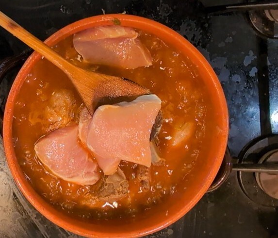Finalmente, si deseas añadir algún trozo de carne más, además de las salchichas y las costillas, ya que la cantidad de carne a consumir es limitada, puedes incluir, como hice yo, unas lonjas de lomo de cerdo. Antes de añadir la col rizada, recuerda hervirla aparte por unos minutos. Luego, pon la col rizada y el lomo al mismo tiempo de cocción, 20 minutos antes de completar la preparación de la cassoeula, asegurando así la consistencia adecuada de la col rizada sin que quede ni demasiado crujiente ni demasiado blanda como para romperse durante la cocción.