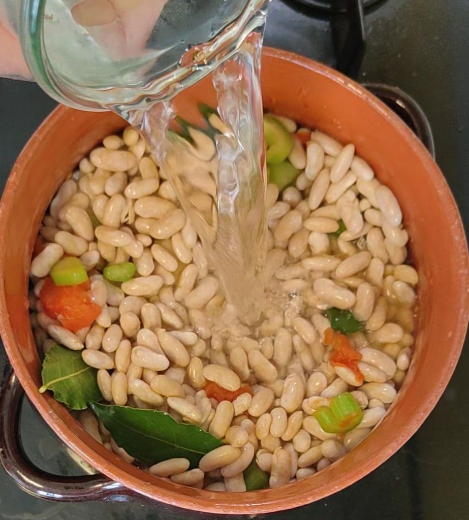 Luego agregar las alubias al sofrito y cubrirlas abundantemente con agua fría. Una vez que llegue a ebullición, dejamos cocinar con la tapa durante unos 60 minutos o hasta que las alubias estén bien cocidas. Todo depende del tipo de legumbre que hayamos elegido, y no hay que preocuparse si el agua no se ha reducido lo suficiente. Al contrario, mejor tener más para que podamos reutilizarla también para conservar las legumbres o para los usos que mencioné anteriormente.