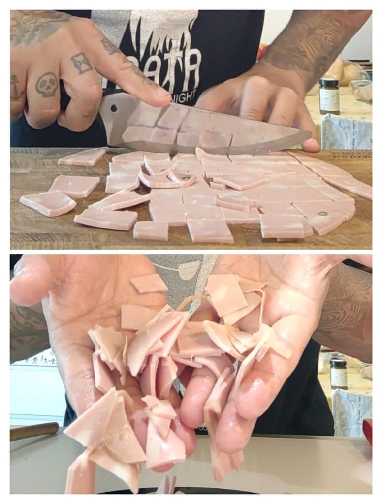 Para empezar ahora a componer la receta utilicé lonchas gruesas de mortadela y las corté en cuadraditos que servirán como base para los espaguetis con pesto de pistacho al trufa. Si prefieres, puedes utilizar también mortadela en pieza y cortarla en cuadraditos de la misma manera.