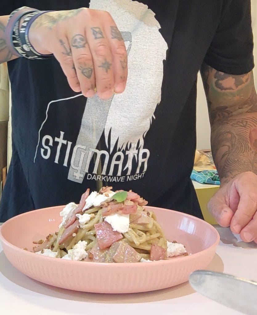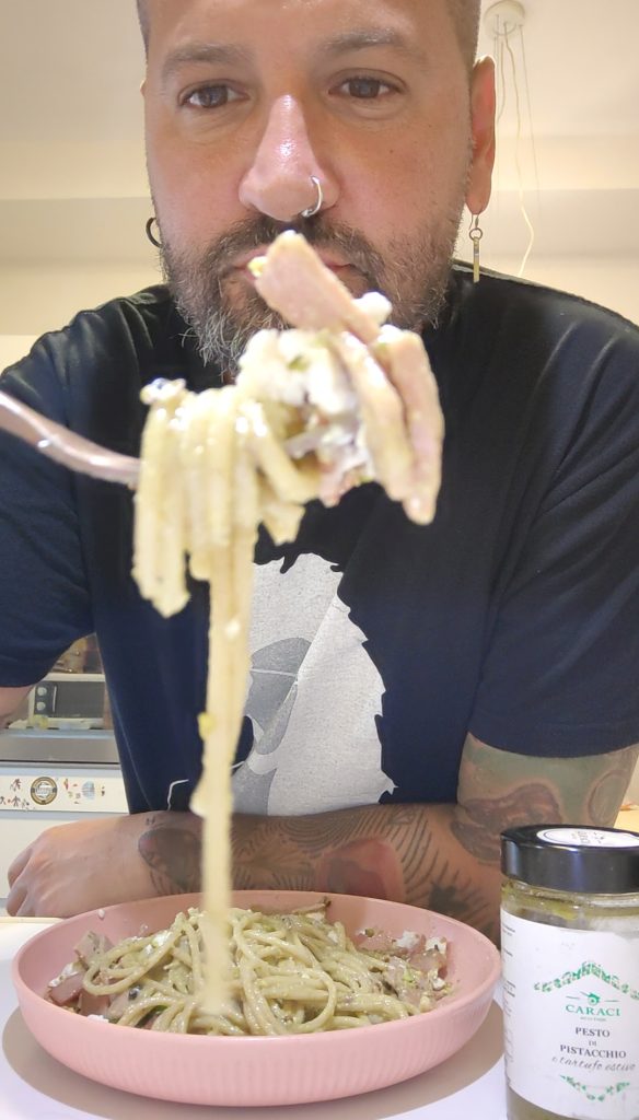 Finalmente cuando la pasta está cocida añado la mortadela unos minutos antes de apagar el gas y posteriormente con el fuego apagado añadimos el pesto de pistacho al trufa de verano.