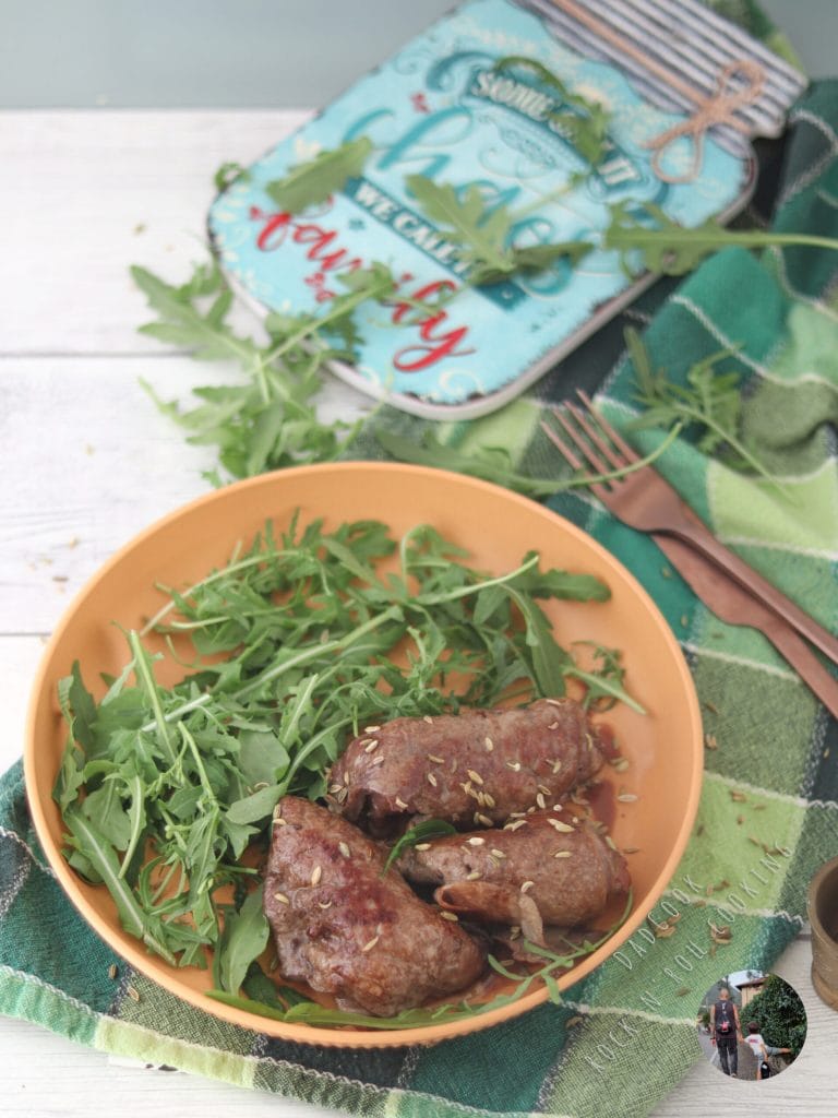 He emplatado y servido el hígado a la Lodigiana con rúcula sin aliñar y algunas semillas de hinojo para decorar cada rollito.