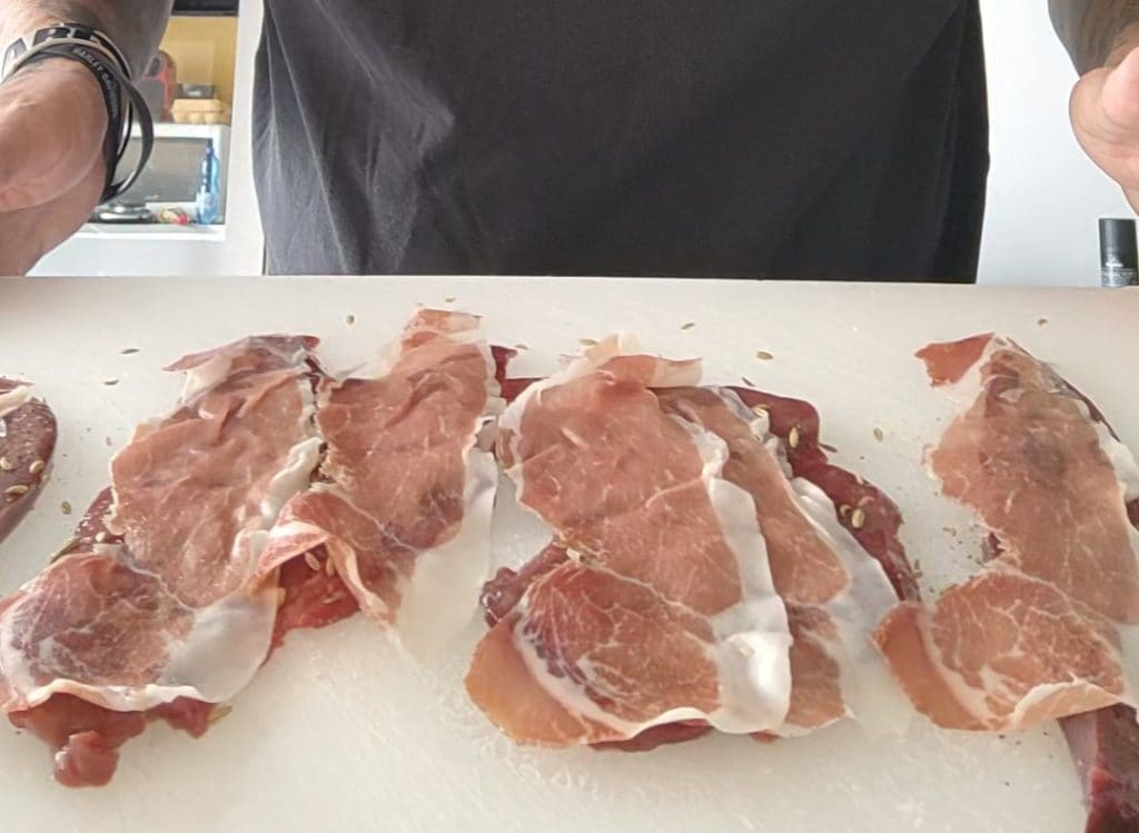 Luego, en cada rodaja de hígado donde ya hemos puesto la sal, la pimienta y las semillas de hinojo, pondremos también una o dos rodajas de jamón crudo.