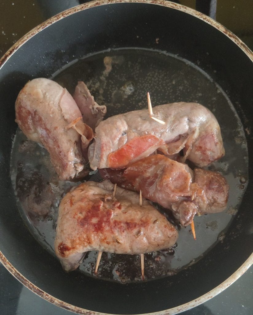Cerrar cada rollito con unos palillos o como os sea más práctico, como por ejemplo con cuerda o red para asados.