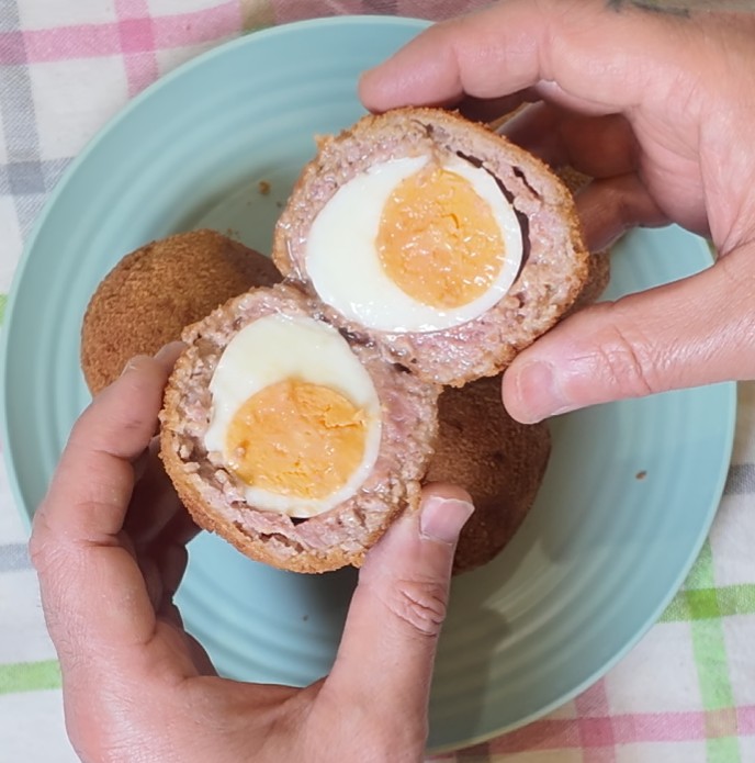 Espero que estos Huevos a la Escocesa, con su costra crujiente y el corazón sabroso de salchicha y mostaza, traigan un toque original y sabroso a tu mesa.