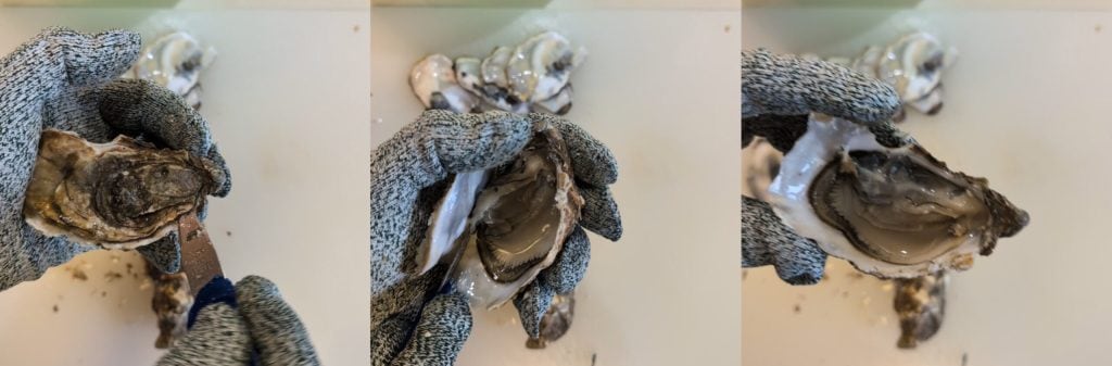 Ahora, equipados con el kit para abrir ostras, es decir, guantes y cuchillo bien afilado, identifica la bisagra de la ostra, que es el punto donde las dos valvas se unen. Coloca suavemente la punta del cuchillo en ese punto y, con un ligero movimiento rotatorio, deslízala hacia adentro unos milímetros. Una vez que la punta del cuchillo haya penetrado, deslízala suavemente a lo largo del borde interno de la concha superior hasta abrirla completamente. Con la hoja del cuchillo, separa el fruto de la concha superior y repite la operación con el resto de las ostras.