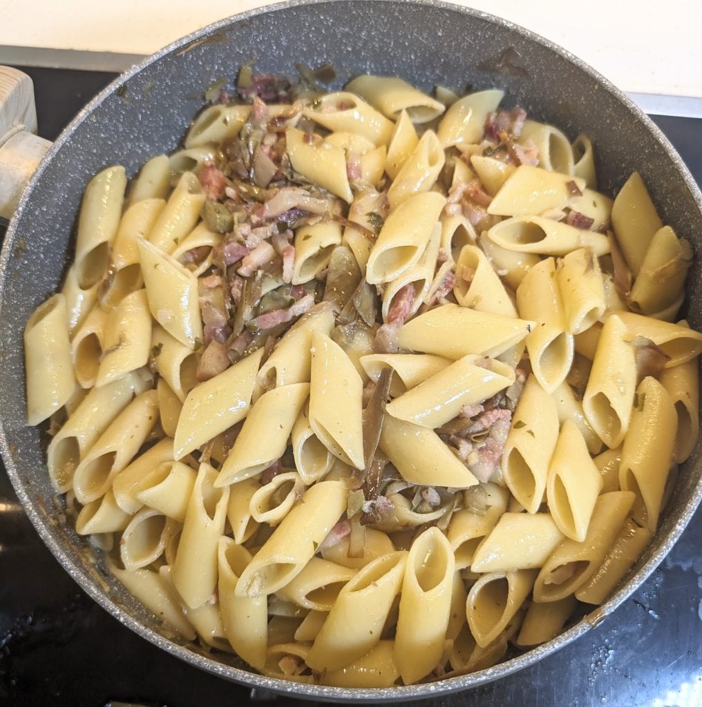 Dejamos cocinar las alcachofas y la panceta durante unos 20 minutos, removiendo de vez en cuando. Mientras tanto, cocinamos la pasta del formato que más nos guste, ya sea corta como los penne o larga como los espaguetis. Yo he utilizado penne grandes y lisos.