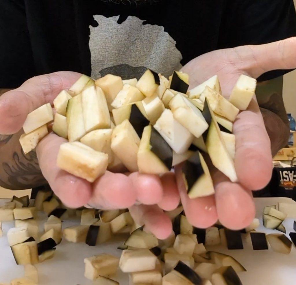 Para hacer la pasta con berenjenas y porcini empecé cortando una berenjena primero por la mitad, luego en rodajas de aproximadamente 1 centímetro de grosor y finalmente en cubos.