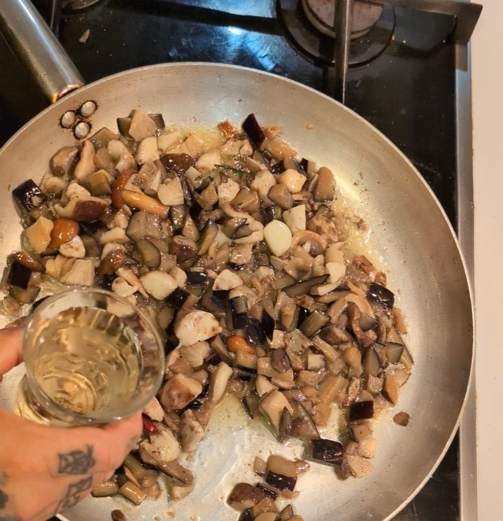 Después de hacer dorar también los hongos porcini junto con las berenjenas, eliminé el ajo y desglasé con un vaso de vino blanco seco.