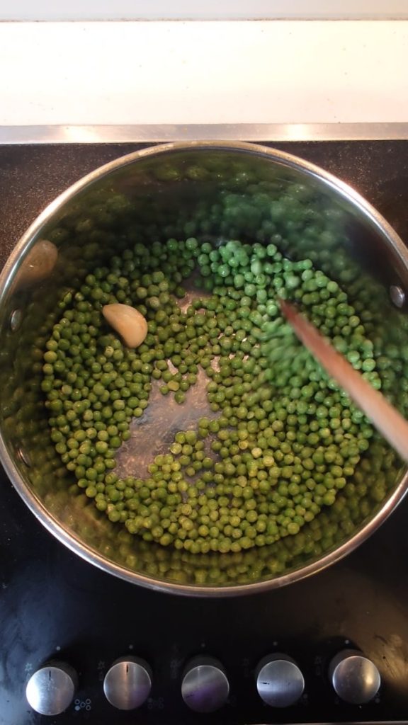 Cuando haya liberado su aroma, podrás retirarlo fácilmente. Añade los guisantes (frescos o congelados) y déjalos sazonar durante un par de minutos, removiendo.