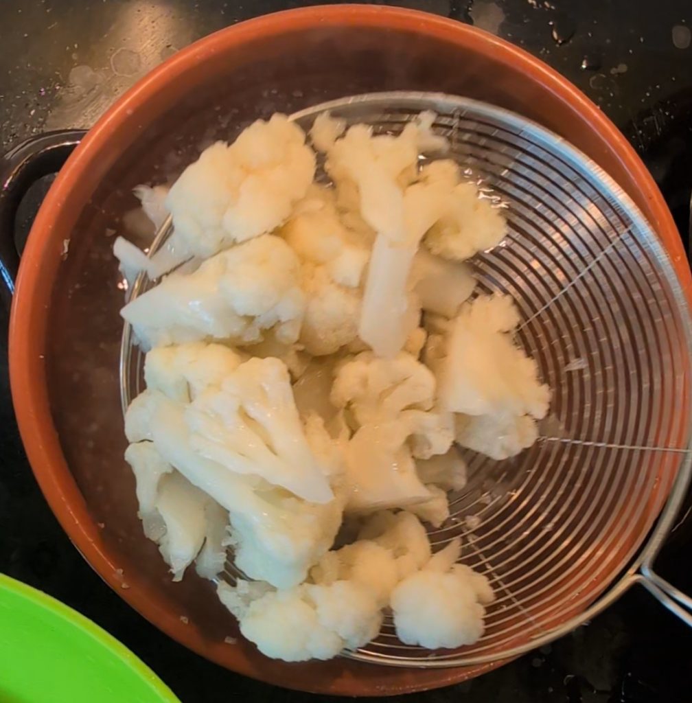 Para evitar que la coliflor se deshaga, no la cuezas en exceso. Escáldala en agua hirviendo con sal durante 8-10 minutos, hasta que esté tierna pero aún ligeramente crujiente.