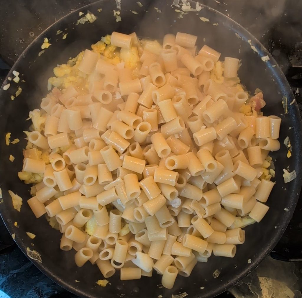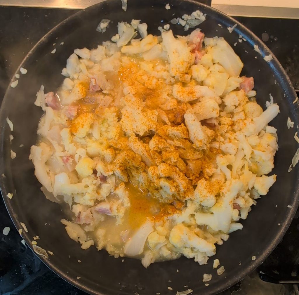Mientras la coliflor se escaldan, preparamos el condimento que hará que nuestra pasta y coliflor gratinada sea aún más sabrosa. Toma una sartén lo suficientemente grande y ponla al fuego a llama media. Vierte un chorrito de aceite de oliva virgen extra y sofríe la cebolla finamente picada y el ajo. Cuando la cebolla esté transparente, agrega la panceta en cubos y deja que se dore sin tostarla demasiado, debe quedar guisada y blanda, revolviendo de vez en cuando. La panceta liberará su grasa, sazonando la cebolla y creando una base deliciosa para nuestro condimento. En este punto, vierte medio cucharón de caldo de verduras caliente para desglasar la sartén y recoger todos los sabores. Agrega la coliflor escaldada y el restante caldo. Deja cocinar a fuego medio-bajo durante unos 10-15 minutos, hasta que el caldo se haya espesado, formando una salsa cremosa. Si te gusta, puedes sazonar la coliflor con un toque de paprika dulce o cúrcuma durante la cocción. Estas especias le darán al plato un toque de color y un aroma particular. Mientras tanto, cocina la pasta en el agua de cocción de la coliflor, escúrrela al dente y agrégala al condimento de coliflor. Revuelve bien todo para mezclar los ingredientes y distribuir la salsa de manera uniforme.