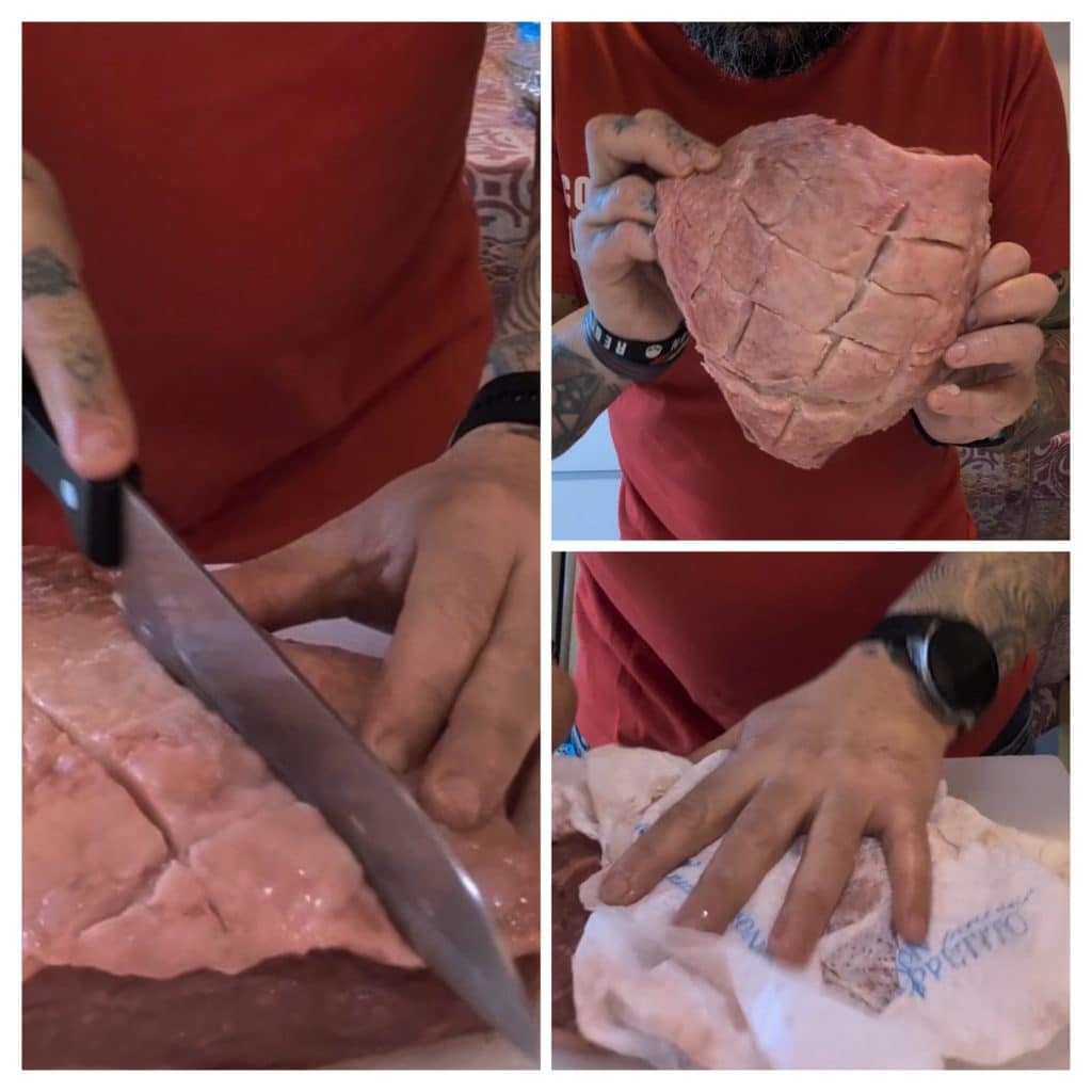 Después de haber eliminado el exceso de grasa, secamos cuidadosamente la picanha con un paño de algodón para dejarla completamente seca. Con un cuchillo bien afilado, hacemos cortes en la capa de grasa creando una cuadrícula de cuadraditos. Presta atención a no cortar la carne debajo: esto evitaría la salida de jugos durante la cocción, comprometiendo la calidad y la consistencia de la picanha.