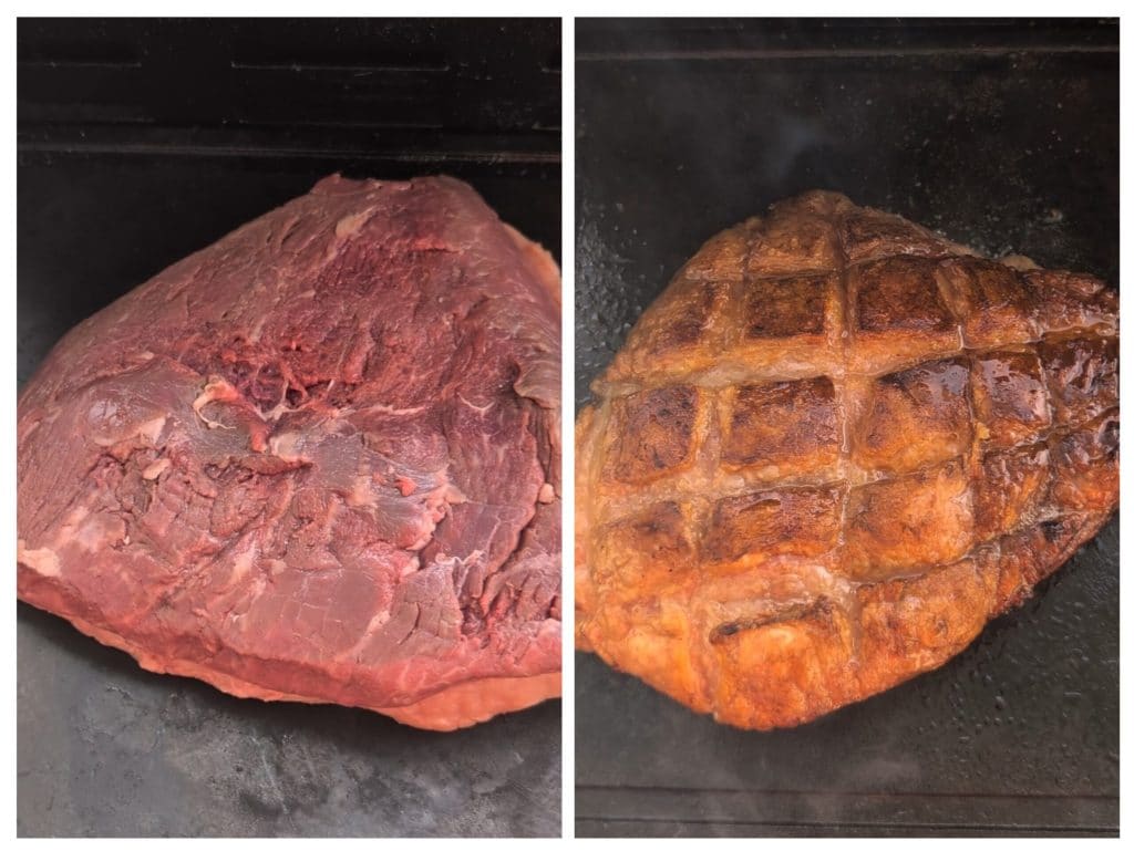Para esta receta elegí una barbacoa a gas con piedra volcánica, que garantiza una cocción uniforme y a alta temperatura, ideal para obtener una picanha perfectamente dorada por fuera y jugosa por dentro. Coloqué la picanha sobre la piedra volcánica precalentada a 180° y cubrí la barbacoa con la tapa. Esto permitió crear un ambiente de cocción similar a un horno, favoreciendo un dorado uniforme y una cocción interna delicada. Después de unos 10 minutos giré la carne y continué la cocción por otros 10 minutos del lado de la grasa, siempre con la tapa cerrada. De esta manera, la grasa se derritió lentamente, haciéndola crujiente e irresistible y otorgando a la carne un sabor aún más rico.