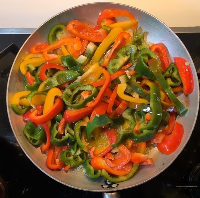 Cuando el ajo comience a dorarse, añadimos los pimientos cortados en rodajas y los cocinamos junto al sofrito durante unos minutos, mezclando a menudo para evitar que el ajo y el chile se quemen. Los pimientos liberarán su agua de vegetación, que será suficiente para evitar que el sofrito se queme.