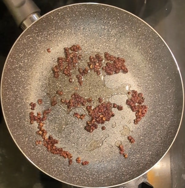 Calienta el aceite de sésamo en una sartén antiadherente a fuego medio. Añade el pimiento de Sichuan y tuéstalo durante 1-2 minutos, o hasta que empiece a liberar su aroma. Si prefieres un sabor más intenso y acentuado, tuéstalo durante 3-4 minutos.